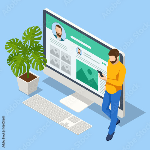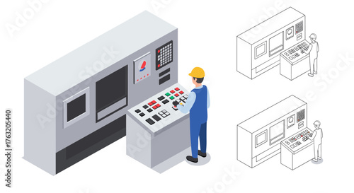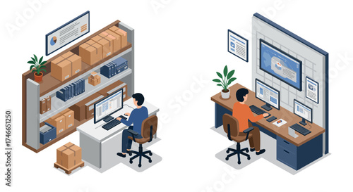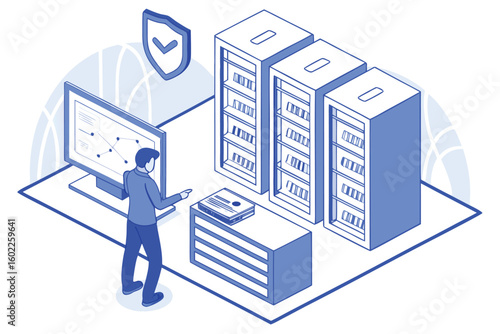 Engineer repairing and fixing server network in data center, flat vector isometric illustration. Server maintenance and repair services.