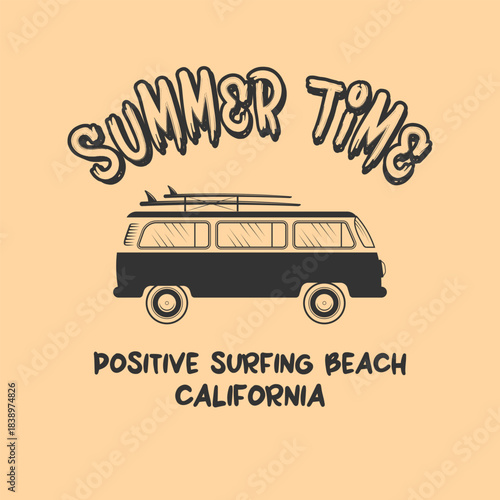 Enjoy summer holidays grunge typography poster design template, vector illustration in retro style. Van, mini bus tour concept for banner, flyer.