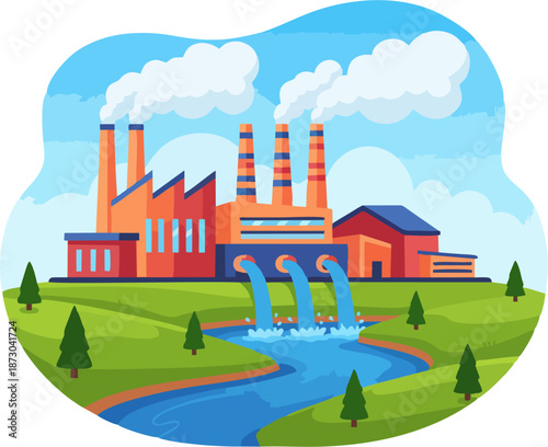 Industrial plant building with smoking pipes, vector illustration in paper art modern craft style. Environmental pollution, save environment, ecology concept for poster, banner etc.