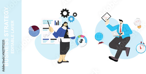 Vector illustration of tiny people watering and trimming plant growing in big pot, picking up garbage into trash bag. Environmental protection concept for web banner, website page etc.
