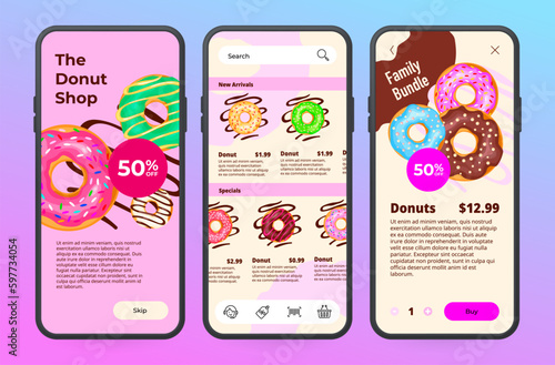 European breakfast. Woman drinking coffee with french croissant and macaroon cookies. Mobile app screens. Vector banner template for website and mobile development. Web site and UI design illustration