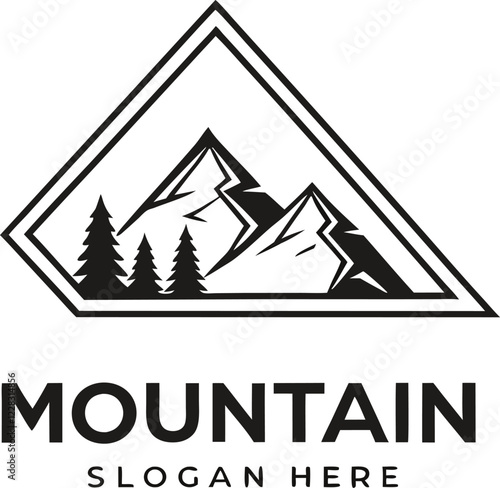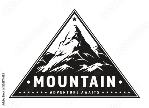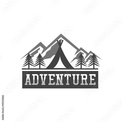 Extreme adventure and camping in mountain forest vintage label. Nature camp graphic sticker emblem isolated on white background. Travel expedition and mountaineering