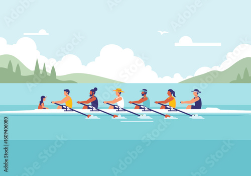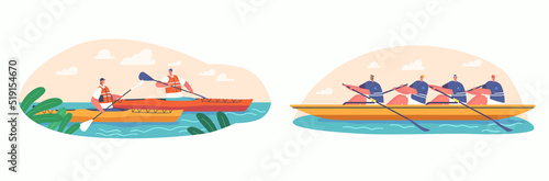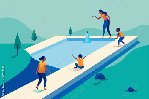 Vector illustration of surfer riding on ocean wave, diver underwater, people paddling, playing frisbee. Beach activity, extreme water sports, outdoor games concept design element in flat style.
