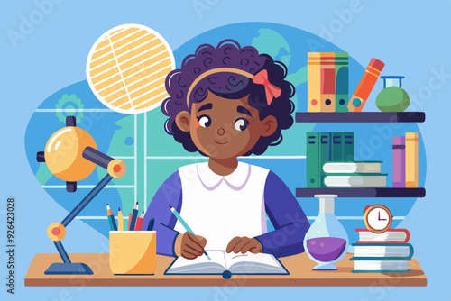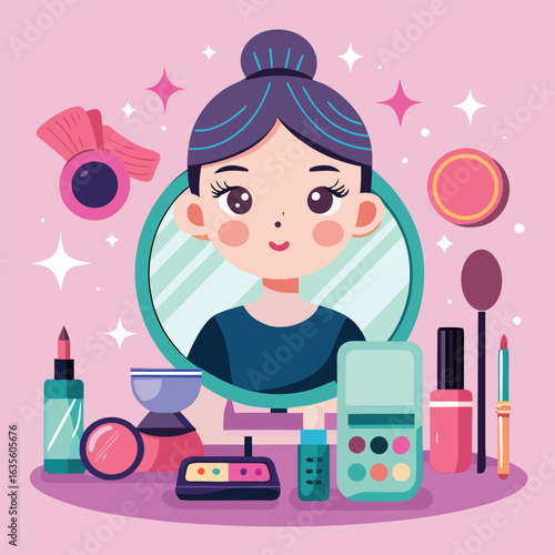 Face beauty and makeup vector poster banner template. Young woman sitting at table with cosmetic skin care products and huge mirror. Makeup classes, beauty parlor services, face care routine.