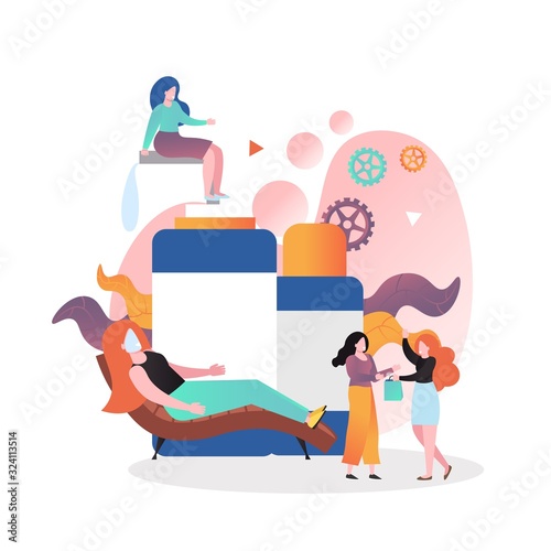 Face care vector concept illustration. Huge cosmetics bottles, micro female characters cosmetologists and client with face mask. Cosmetology, beauty salon services, beauty facial procedures.