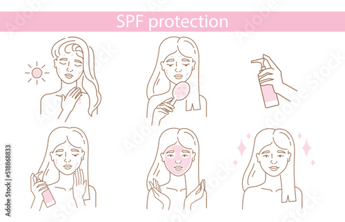 Face serum application steps, line art style vector illustration. Use of anti aging, antioxidant, hydrating serums. Face skin care routine, beauty procedure.