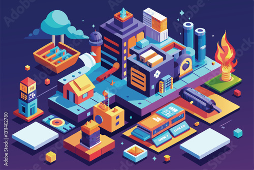 Factory automated production line vector flat isometric illustration with conveyor belt, industrial robots and manufacturing equipment.