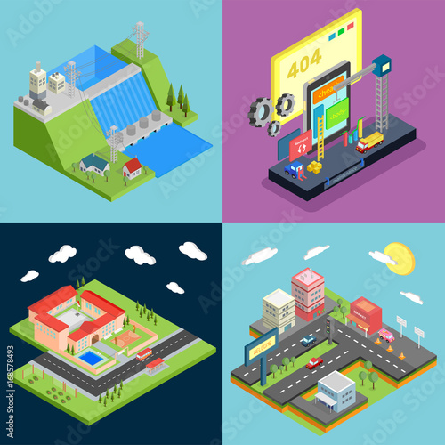 Factory automation vector flat isometric poster set. Electronics factory, Packaging manufactory, Car assembly, Medical factory concept design elements for web banners, print, infographics.