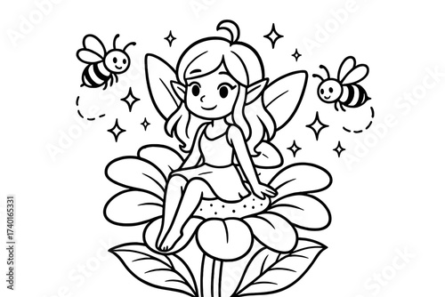 Cute fairy vector illustration. Cartoon magic girl character with wings. Fairytale princess in costume sitting on flower and waking up. Fantasy little forest pixie isolated on white background