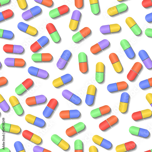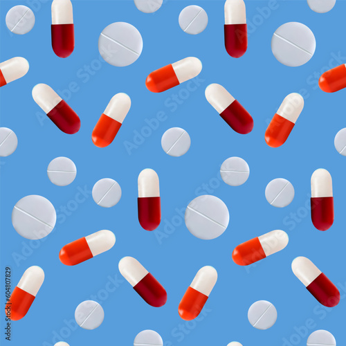 Falling pills seamless pattern. Vector realistic pharmaceutical capsules, tablets, caplets and softgels.
