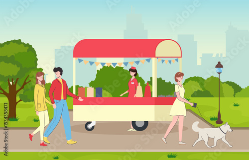 Family couple on picnic or bbq. Woman and man eating grilled sausages while sitting at picnic table. Vector flat style design illustration.
