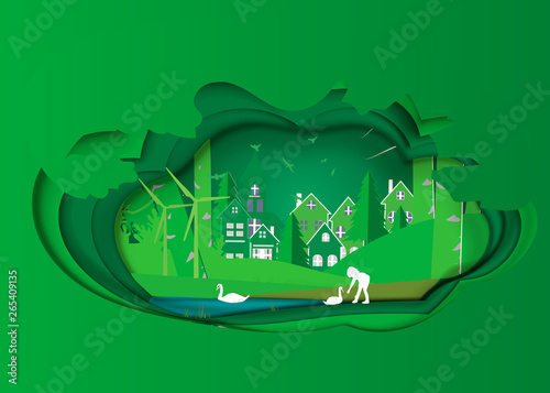 Family biking, vector layered paper cut style illustration. Happy family with backpacks riding bicycles, enjoying outdoor walking. Biking tourism, active weekend concept for poster, banner etc.