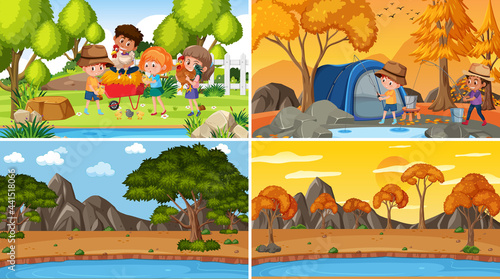 Family camp in forest vector illustration. Cartoon people rest in mountain during summer vacation trip. Outdoor picnic scene. Parent and child recreation at campfire. Hiking travel landscape