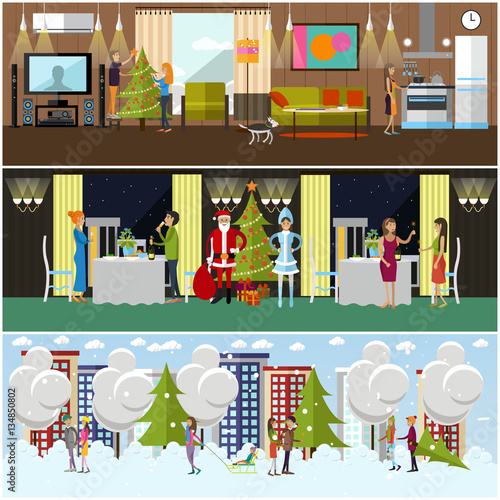 Vector set of posters with family characters engaged in domestic chores in house and taking rest outside. Family people walking in the street, cooking, playing football. Flat style design.