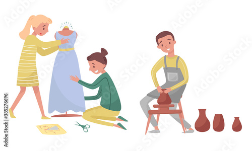 Family Easter celebration scene set, flat vector isolated illustration. Happy grandparents, parents and kids with bunny, decorated Easter eggs, cake, basket and pussy willow branches. Egg hunt game.