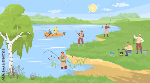 Family fishing spend time together cartoon vector illustration. Fishery hobby, travelling, active vacation and camping concept