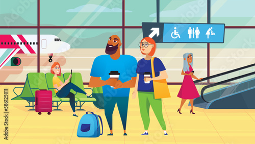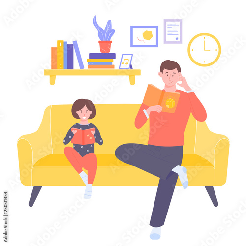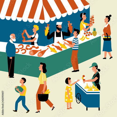 Vector illustration of father, mother and daughter doing shopping at grocery store or supermarket. Family purchases concept design element in flat style.