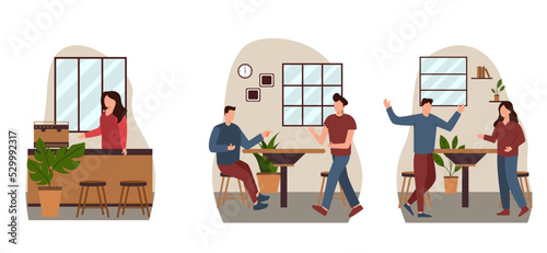 Family repair and remodeling home interior. Concept vector posters set. Couple paint walls and decorate house. People choosing wallpapers in diy store. Apaprtment renovation.