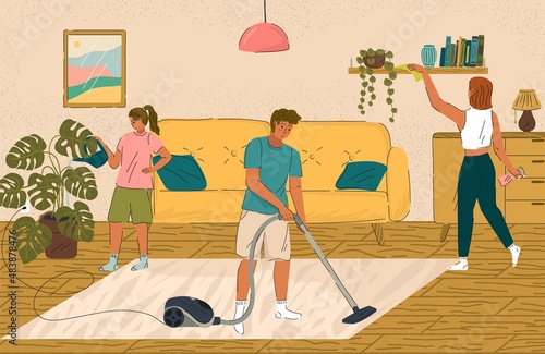 Family repair home and paint walls together. Vector illustration. People wallpapering and painting wall in apartment. House renovation, room decorating, repair apartment.