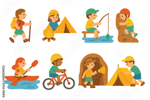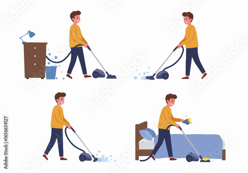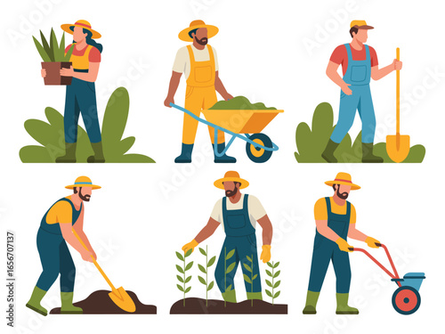 Farm life scenes set. Grass mowing, hay harvesting, planting seedlings isolated vector. People farmer working on farm illustration. Agriculture worker character over rural landscape
