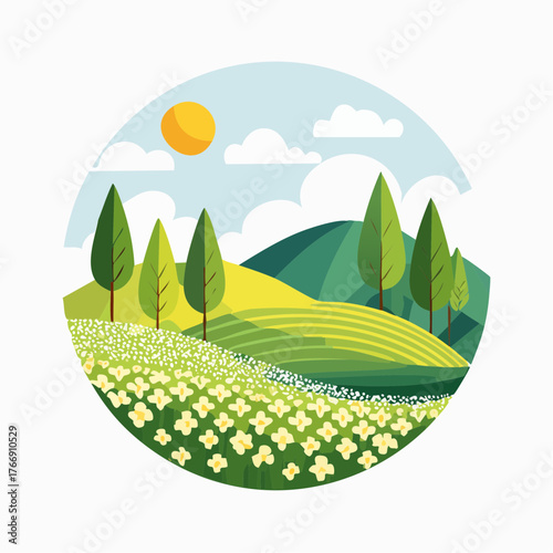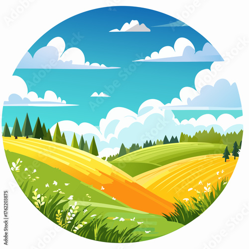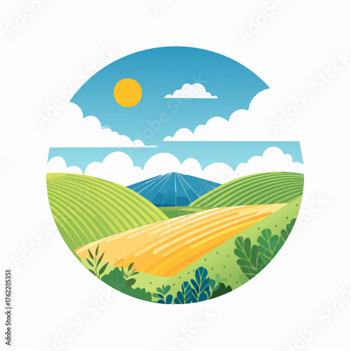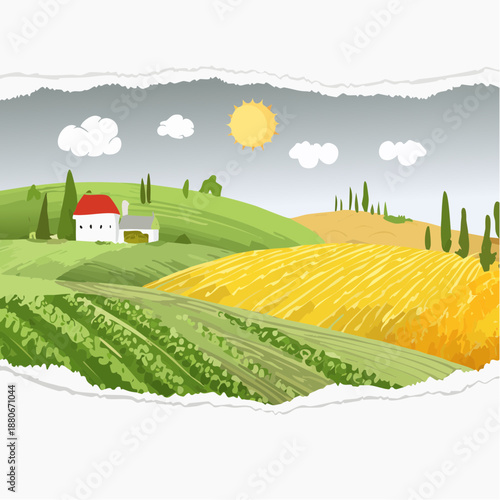 Farm vector logo. Ranch with organic field. Rural landscape with tractor, mill and barley or wheat hills. Farmhouse in countryside. Paper cut style