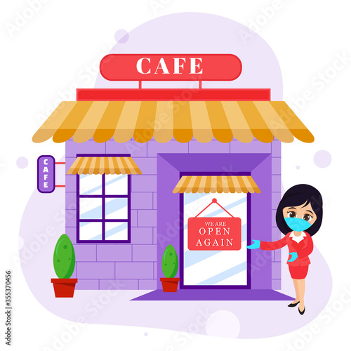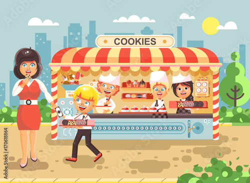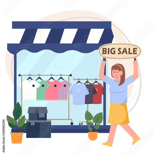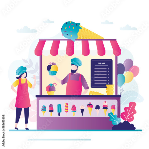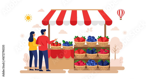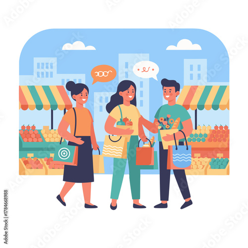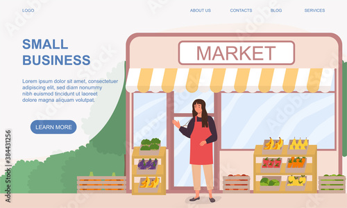 Farmer in local market offers fresh vegetables and grocery in street food stall. Farm marketplace and shop. Concept illustration. Vector web site design template. Landing page website illustration.