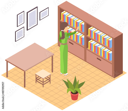 Farmer making crop growth analysis in greenhouse using robotics technologies, flat vector isometric illustration. Smart greenhouse horticulture robotics. Smart farming.