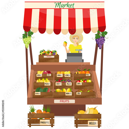 Street market stall, saleswoman, girl buying bananas and cleaning products, man moving cart with grape, vector illustration. Bazar, fruit and vegetable farmers market composition for web banner etc.
