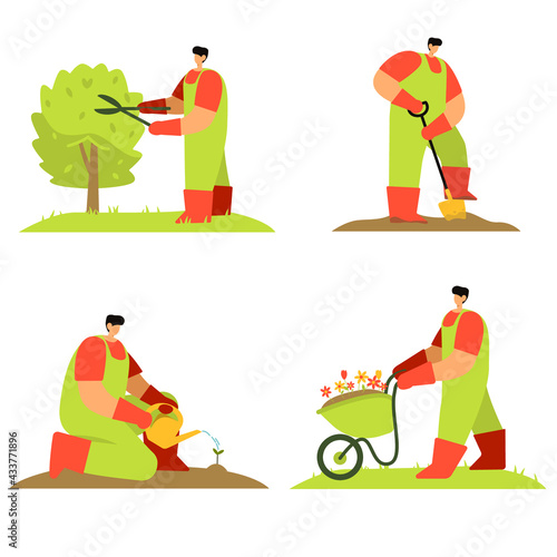 Farming coffee production stages flat vector scene set. Man woman farmer picking, loading to industrial grinder, drying and roasting coffee beans illustration