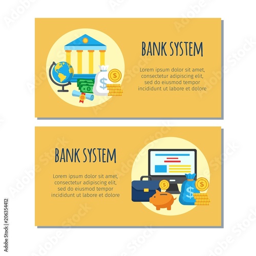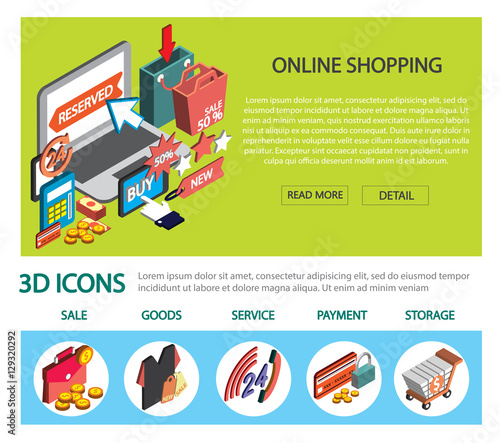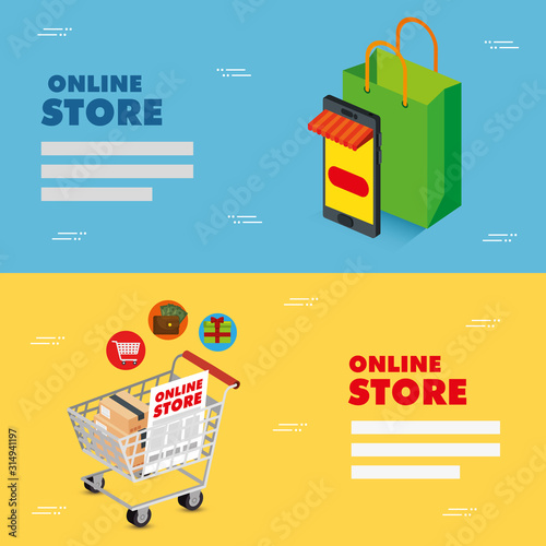 Vector set of fast food cart horizontal banners. Bakery, coffee, beer and fruit cart isometric icons, place for text.