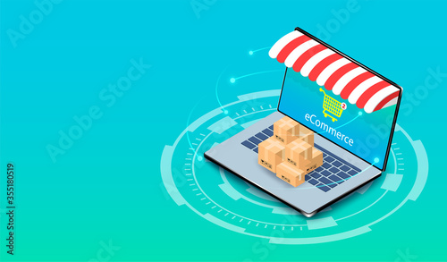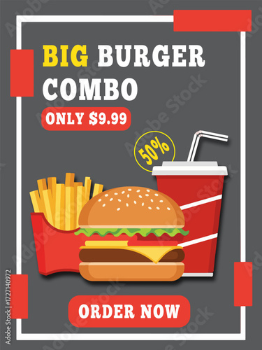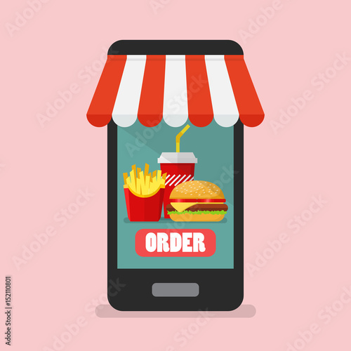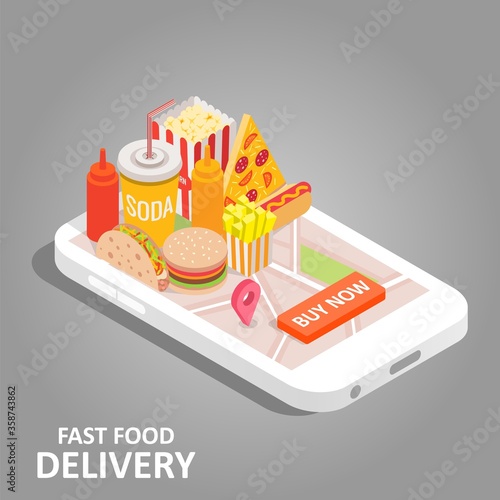 Fast food online concept. Vector isometric smartphone with food delivery app. Pizza, burger, french fries, hot dog, soda popcorn, navigation map with pin marker, buy now button on smart phone screen.