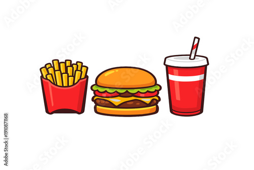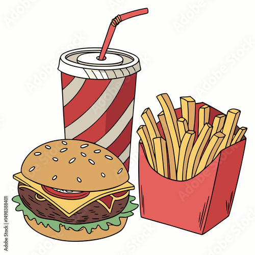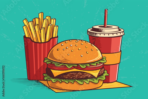 Fast food poster in retro pop art style. Vector comic illustration. Concept graphic background with burger, fries and soda.