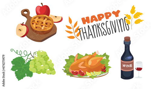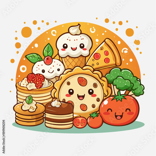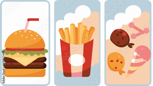 Fast food set. Flat cartoon classic american cheese burger, pizza slice, fried chicken leg and french fries, soda drink plastic bottle, muffin and cakes desserts vector illustration isolated on white