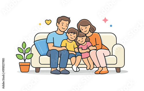 Father and mother comforting caring crying sad little girl daughter vector illustration. Parents supporting unhappy stressed child sitting on home sofa isolated on white background