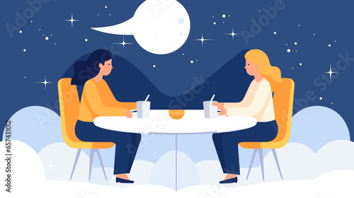 Father and son looking through telescope spending time together outdoors vector illustration. Dad and boy exploring galaxy universe and celestial bodies in starry sky