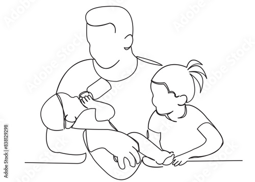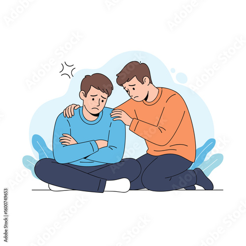 Father talking and playing with little boy son vector illustration. Parent and kid sitting on floor and having nice conversation isolated on white background. Happy family and parenthood concept