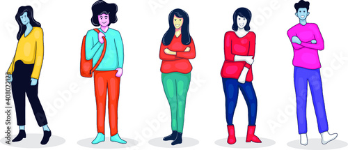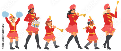 Female adults and children orchestra march vector illustration. Cute marching young woman and kids in red uniform playing musical instrument isolated on white background