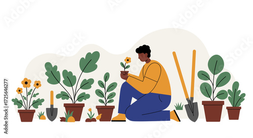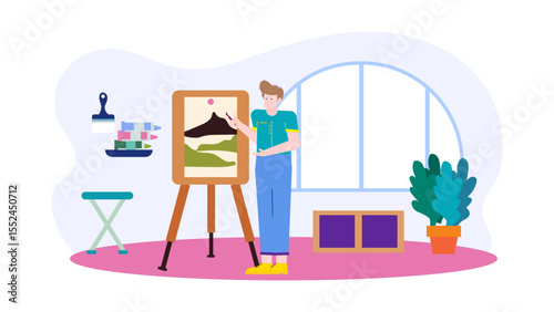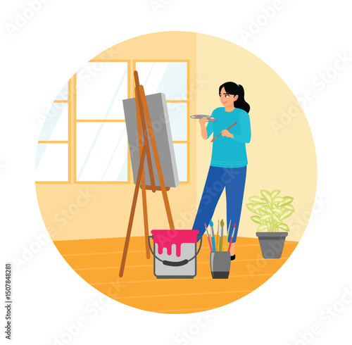 Female artist paints geometric abstract art work. Art therapy concept illustration. Vector web site design template. Paintbrush, palette, canvas, colors. Artist at work.
