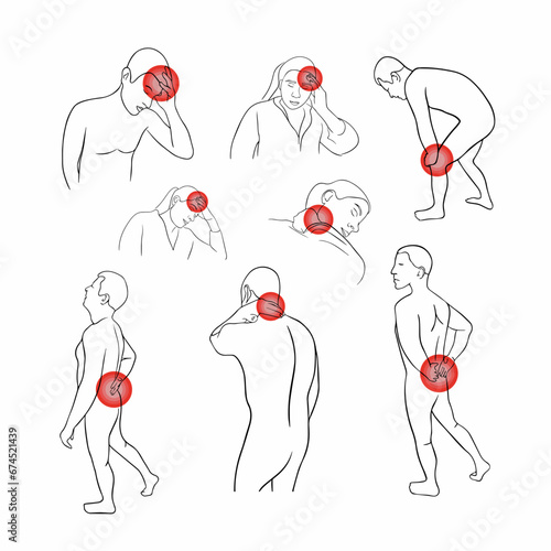 Female body painful zone set, vector illustration. Sick patient body parts hurt areas with red pain dots. Migraine, headache, backache, stomach, foot, wrist, shoulder ache, menstrual pain.