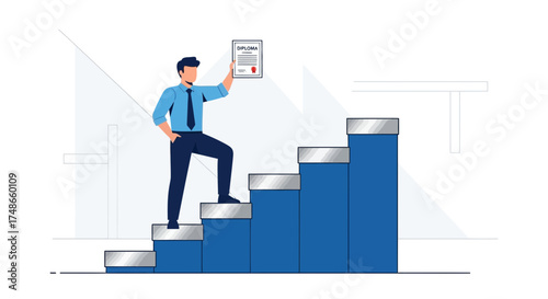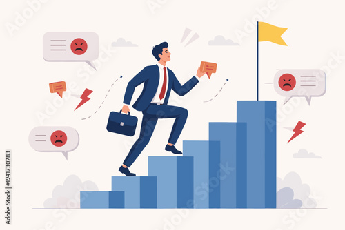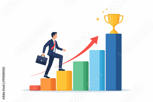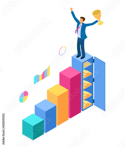 Female boss leader standing on bar chart top and male employee falling down from it, flat vector illustration. Feminism concept.