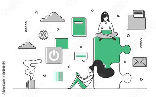 Female graphic designer experiencing creative crisis or block, flat vector illustration. Woman sleeping sitting at table in front of laptop. Creativity crisis, anxiety, fatigue, headache, depression.