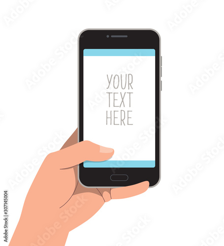 Female hand holding smartphone, flat vector illustration. Hand interacting with modern mobile phone vertical mockup.