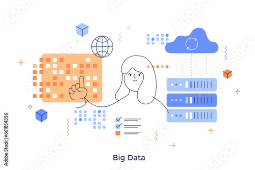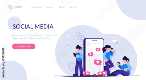 Female photographer take photo at home studio. Photo camera on tripod. Room interior. Concept illustration. Vector web site design template. Landing page website illustration.