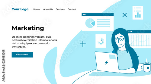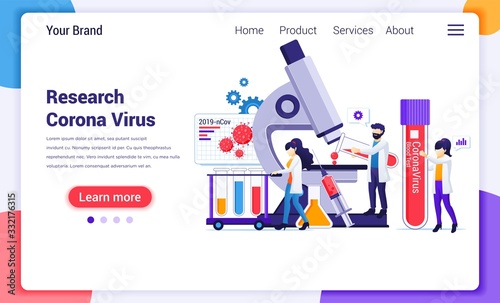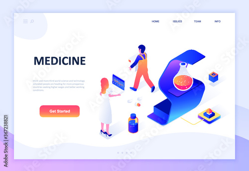 Female scientist analyzing blood in lab microscope. Vector flat illustration. Scientific research, laboratory experiment, science and education. Woman student in medical lab.