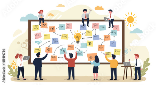Micro photographers hanging up huge film photos to dry on rope, vector illustration. Film photo printing services concept for web banner, website page etc.