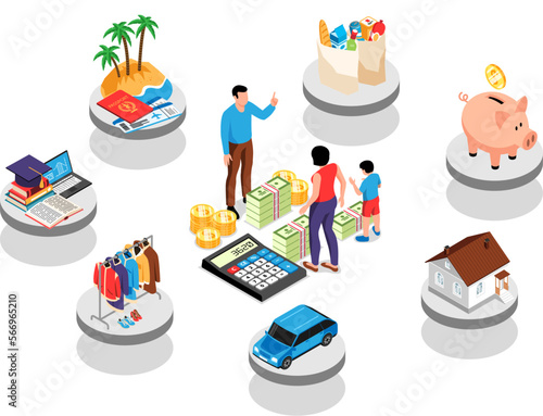 Finance management vector. Budget planning pie chart illustration. Expenses calculation for healthcare, travel and vacation, education, car and new apartment purchase, savings