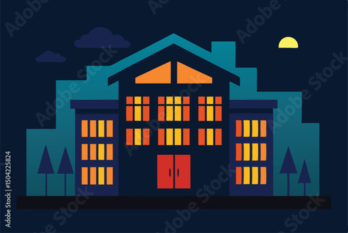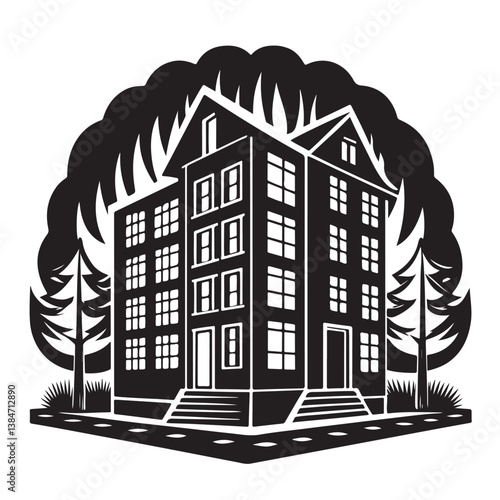Firefighter rescue team extinguishing burning urban residential house apartment on massive fire vector illustration in papercut style. Dangerous situation in city