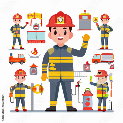 Firefighter uniform, tools and equipment set flat vector isolated illustration. Fireman, red fire engine, water hose, extinguisher, hydrant, ladder, axe, bucket, fire alarm, hook, helmet and gas mask.