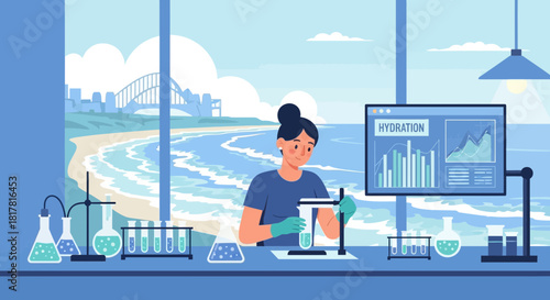 Fish shop showcase and saleswoman at counter desk vector icon isolated on white background