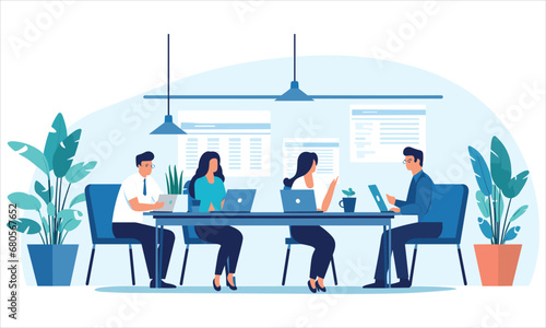 Fish store, flat vector illustration. Saleswoman standing at display fridge counter with fresh and tinned fish. Fishmonger shop, market. Supermarket, grocery store seafood section, department.